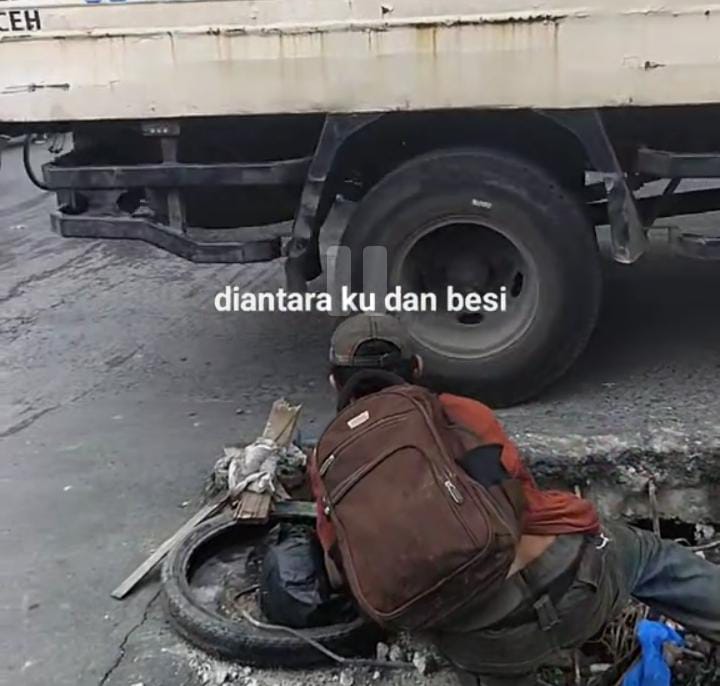 Rekaman menunjukkan si pria memakai pakaian sederhana, tanpa alat keselamatan, namun tetap fokus mengungkit dan menarik besi dari lubang jalan yang sudah retak. Sementara itu, pengendara yang melintas tampak memperlambat laju motor mereka, sebagian terlihat heran, namun tak ada yang menghampiri pria tersebut.